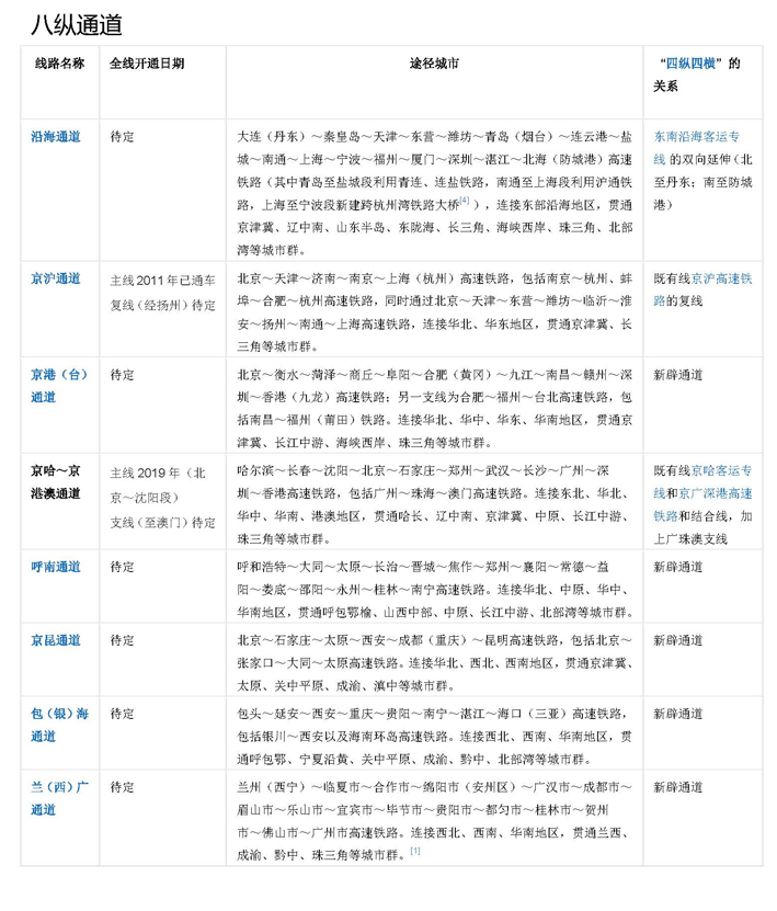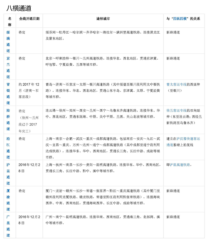 "八縱八橫" 是中國高速鐵路網絡的短期規劃圖。2016年7月,國家發展改革委、交通運輸部、中國鐵路總公司聯合發布了《中長期鐵路網規劃》,勾畫了新時期“八縱八橫”高速鐵路網的宏大藍圖。 “八縱”通道包括沿海通道、京滬通道、京港(臺)通道、京哈~京港澳通道、呼南通道、京昆通道、包(銀)海通道、蘭(西)廣通道。“八橫”通道包括綏滿通道、京蘭通道、福銀通道、青銀通道、陸橋通道、沿江通道、滬昆通道、廈渝通道、廣昆通道。