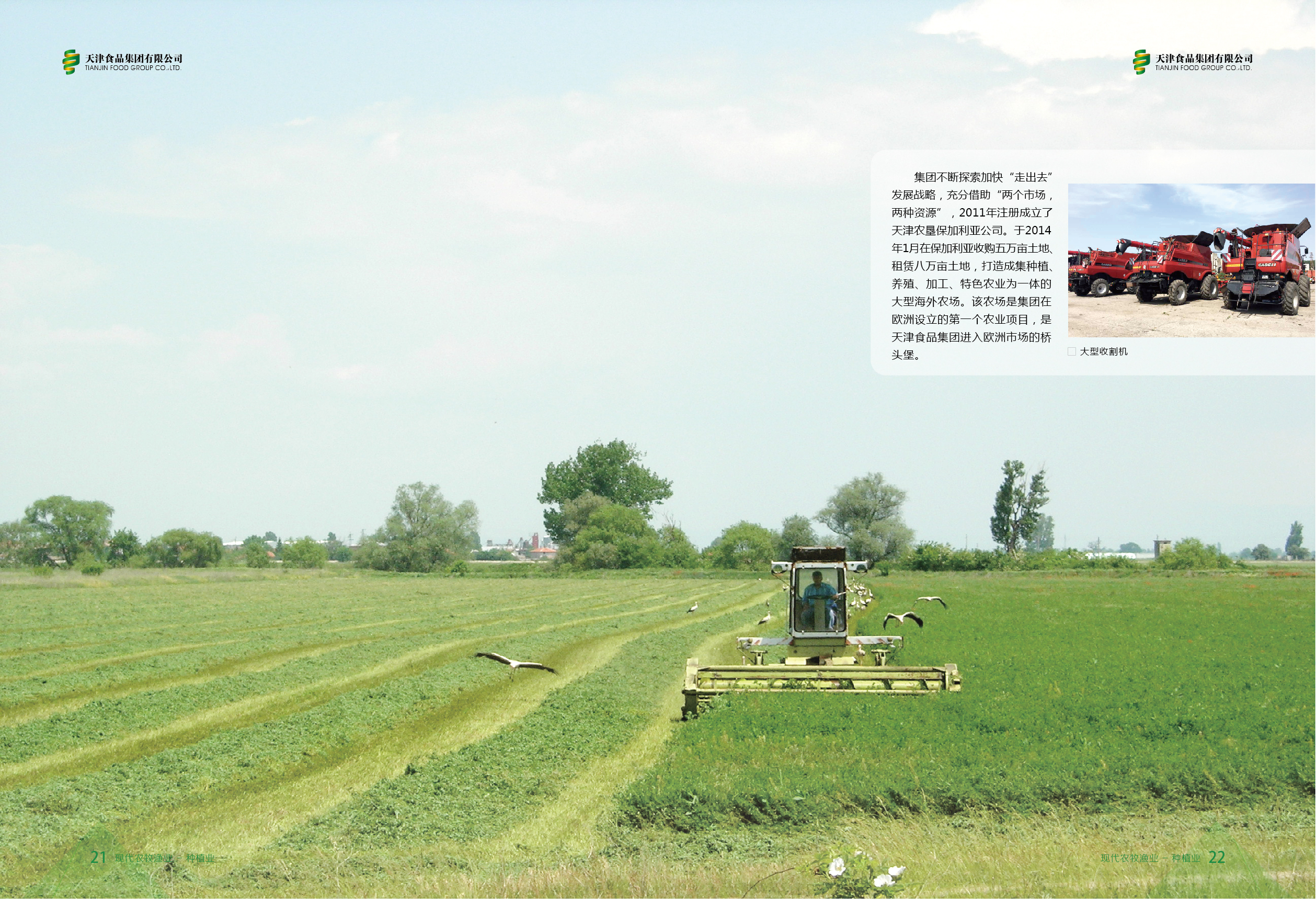 集團不斷探索加快“走出去”發展戰略,充分借助“兩個市場,兩種資源”,于2011年成立天津農墾龍呈嘉益國際貿易有限公司,在保加利亞收購、租賃土地,打造成集種植、養殖、加工、特色農業為一體的大型海外農場。該農場是集團在歐洲設立的第一個農業項目,是天津食品集團進入歐洲市場的橋頭堡。The Group quickens its pace to implement the “going global” development strategy, and fully leverages the “two markets, two resources” advantage. In 2011, Tianjin Agriculture Reclamation Longcheng Jiayi International Trade Co., Ltd. was established. The company acquires and leases land in Bulgaria, and builds a large overseas farm that combines planting, breeding, processing and characteristic agriculture. The farm is the first agricultural project the Group launched in Europe, and is also the “bridgehead” for Tianjin Food Group to enter the European market.