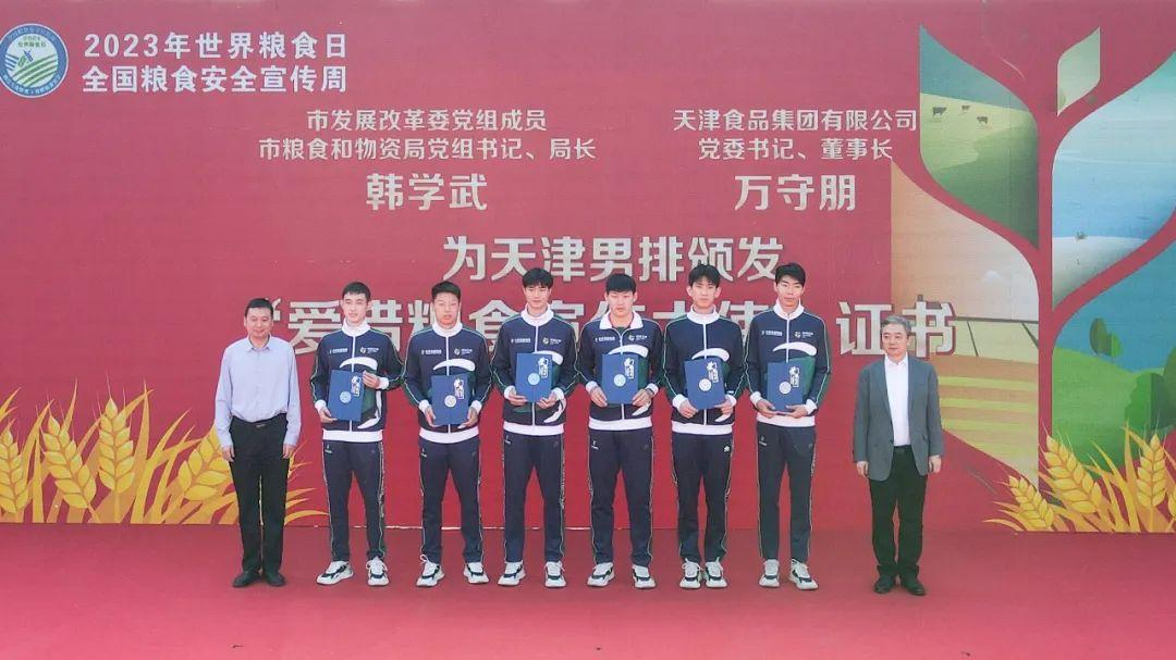 韓學(xué)武、萬守朋為天津食品集團(tuán)男排頒發(fā)“愛惜糧食宣傳大使”證書。旨在進(jìn)一步宣傳節(jié)約光榮、浪費可恥的思想觀念,倡導(dǎo)全民健身活動,倡導(dǎo)健康文明的新生活方式。
