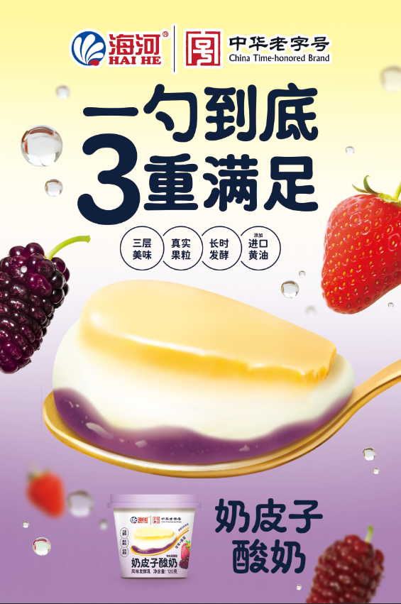 輕輕揭開杯蓋,來一場(chǎng)舌尖上的立體穿越。啟程于凝脂般金黃濃醇的奶皮子,特選進(jìn)口黃油在單杯慢發(fā)酵時(shí)光中凝萃的精華,每一口都是濃郁的脂香序曲。勺子如探險(xiǎn)家般向下穿梭,觸達(dá)雪白柔滑的酸奶腹地,自然發(fā)酵的清新酸香溫柔承接。而旅程的高潮,在杯底熱烈綻放,大顆草莓與桑葚果粒浸潤在絳紫色果醬中,如同埋藏的味覺寶藏。一勺到底,不是簡(jiǎn)單的分層品嘗,而是一次從濃郁奶脂、清新乳香到鮮活果粒爆漿的完整味覺敘事,金黃、雪白、絳紫在口中奏響出層次分明的交響曲。這杯酸奶,讓“吃”變成一場(chǎng)奇妙的感官旅程,直接開辟了“果粒奶皮子酸奶”這一全新細(xì)分賽道,海河乳品公司也成為該領(lǐng)域無可爭(zhēng)議的定義者與領(lǐng)跑者。