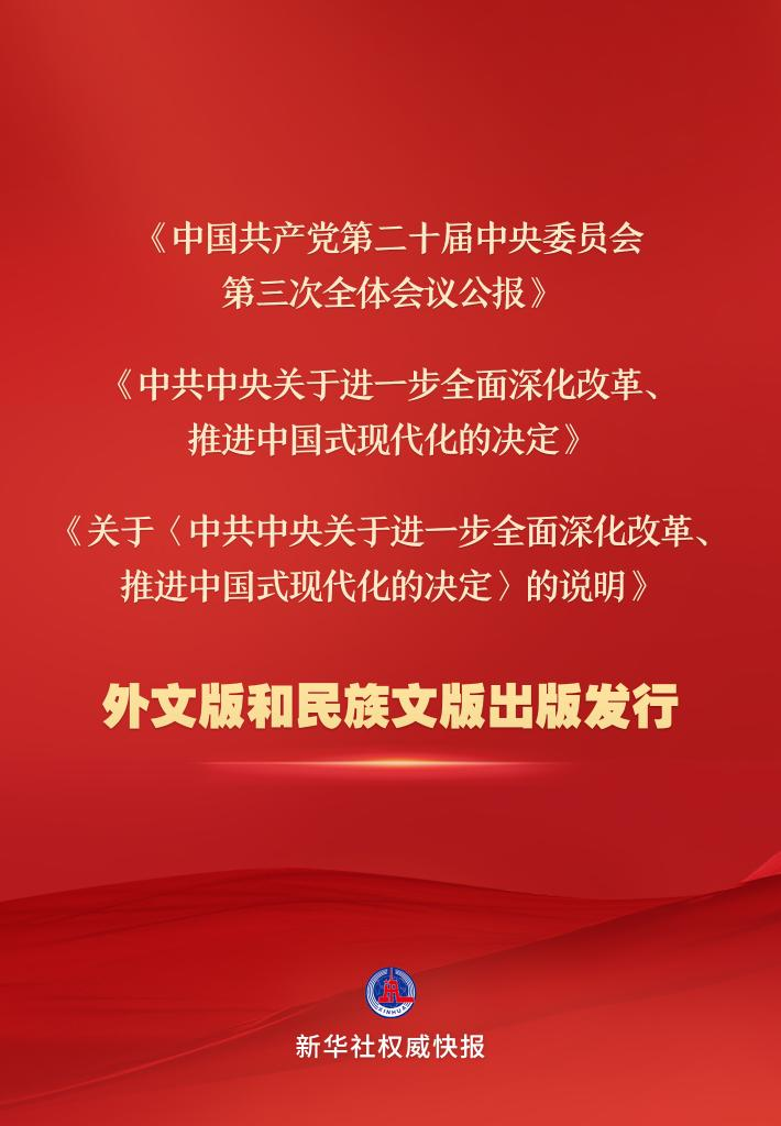 《中國共產黨第二十屆中央委員會第三次全體會議公報》《中共中央關于進一步全面深化改革、推進中國式現代化的決定》《關于<中共中央關于進一步全面深化改革、推進中國式現代化的決定>的說明》的英文、法文、西班牙文、日文、俄文、德文、阿拉伯文、葡萄牙文、越南文、老撾文等10種外文版已由中央編譯出版社、外文出版社出版,面向國內外公開發行。